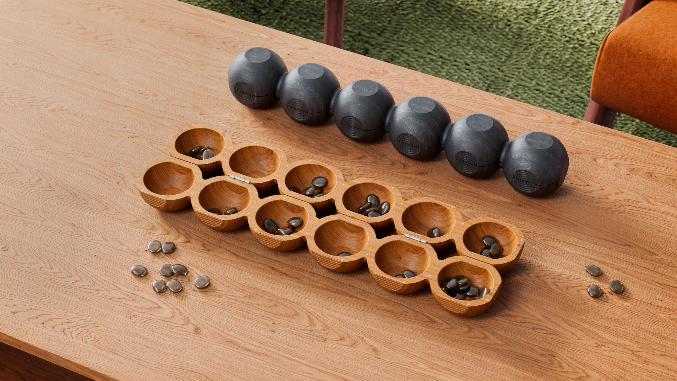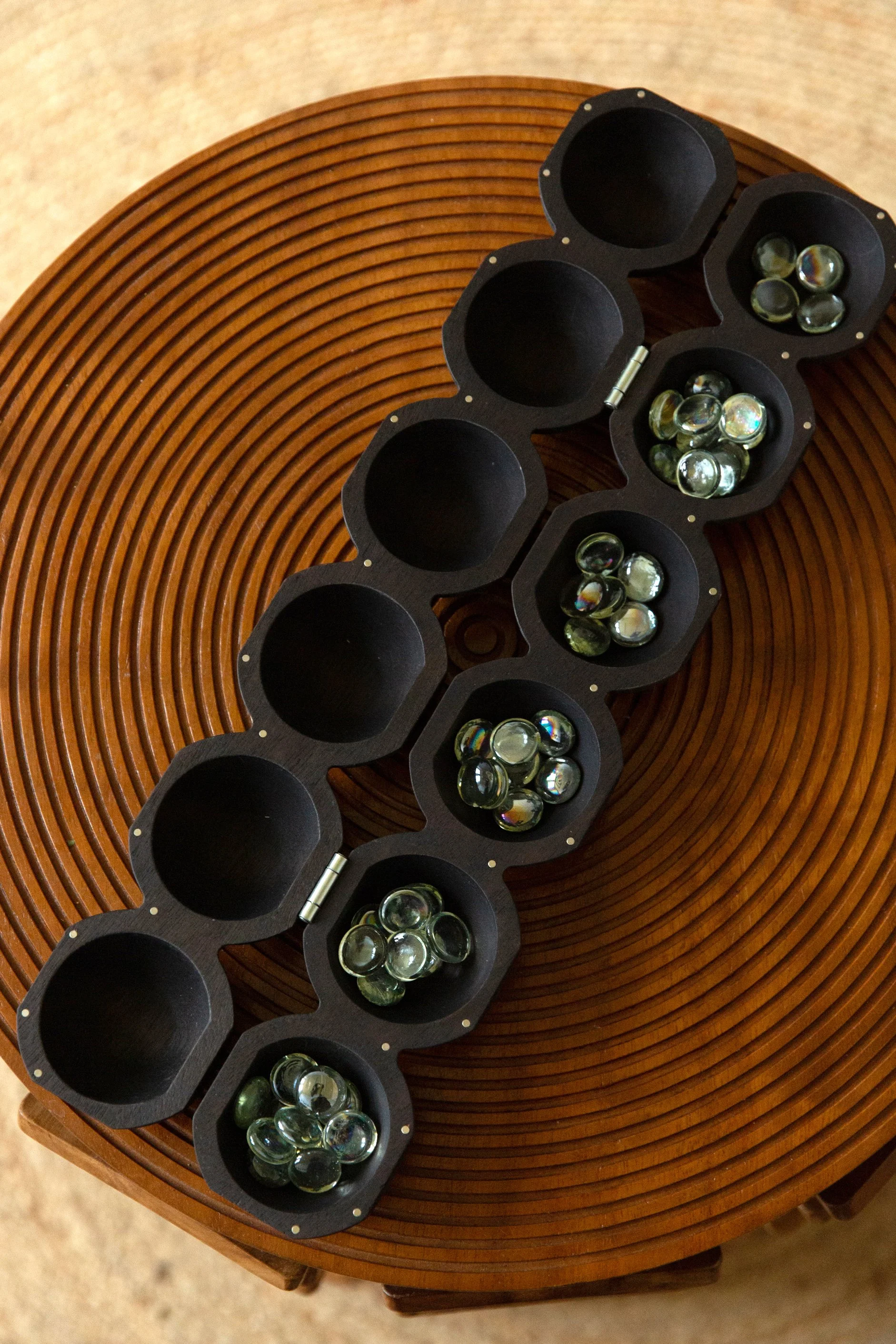 Though inspired by the vast approaches to board design across Africa, Nchọ is the result of an intentional engagement with the woodworking traditions of the Igbo people, taking specific cues; rhythmic lines carved into the wood show you just where to open it & its globular form is a nod to both small personal effigies, which carry meaning to a person, & towering sculptural columns in meeting houses built for community interaction. In this way, the board celebrates both modes: drawing people together to play and remember how to play, and being an object of beauty within a personal space.