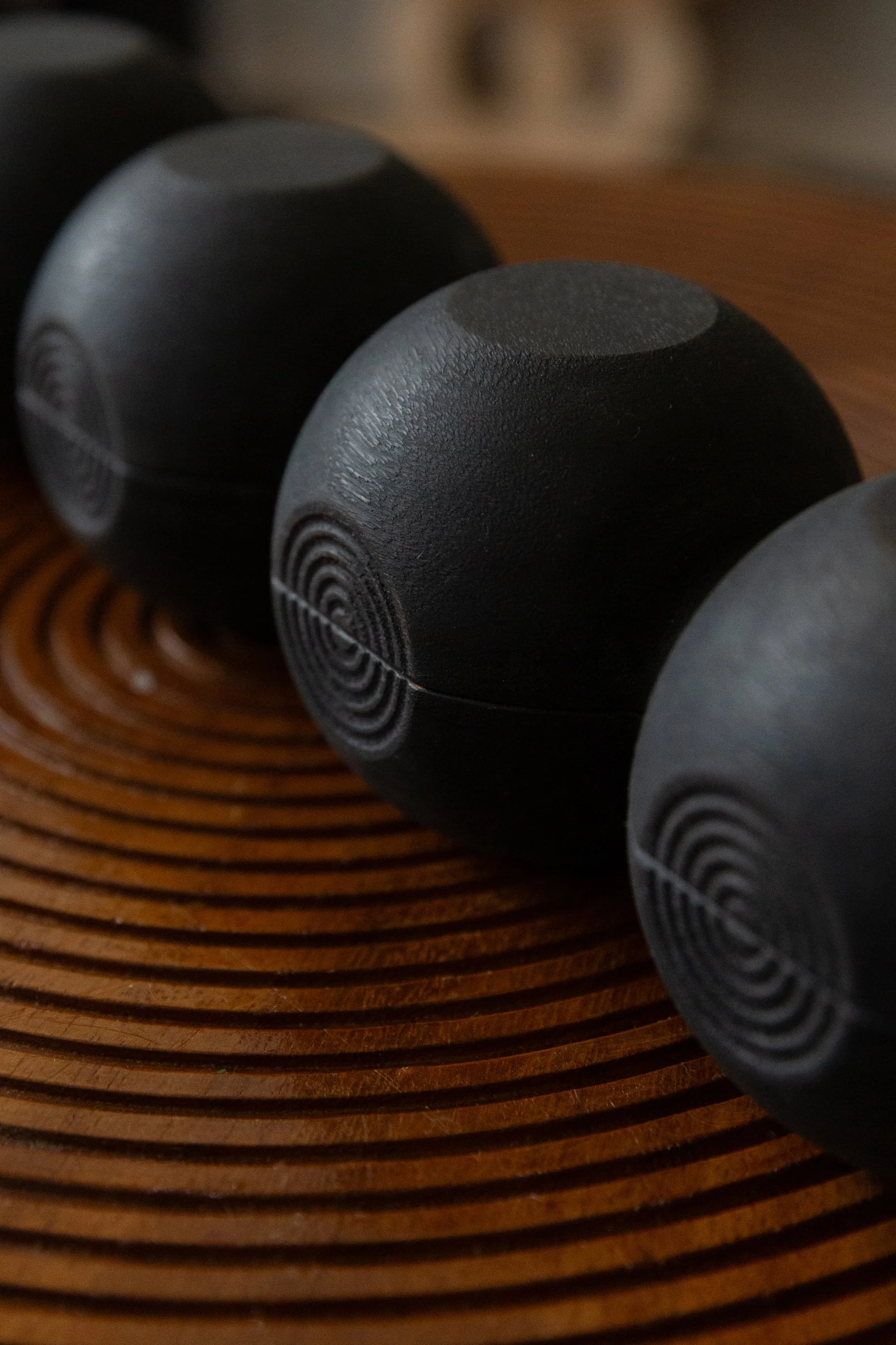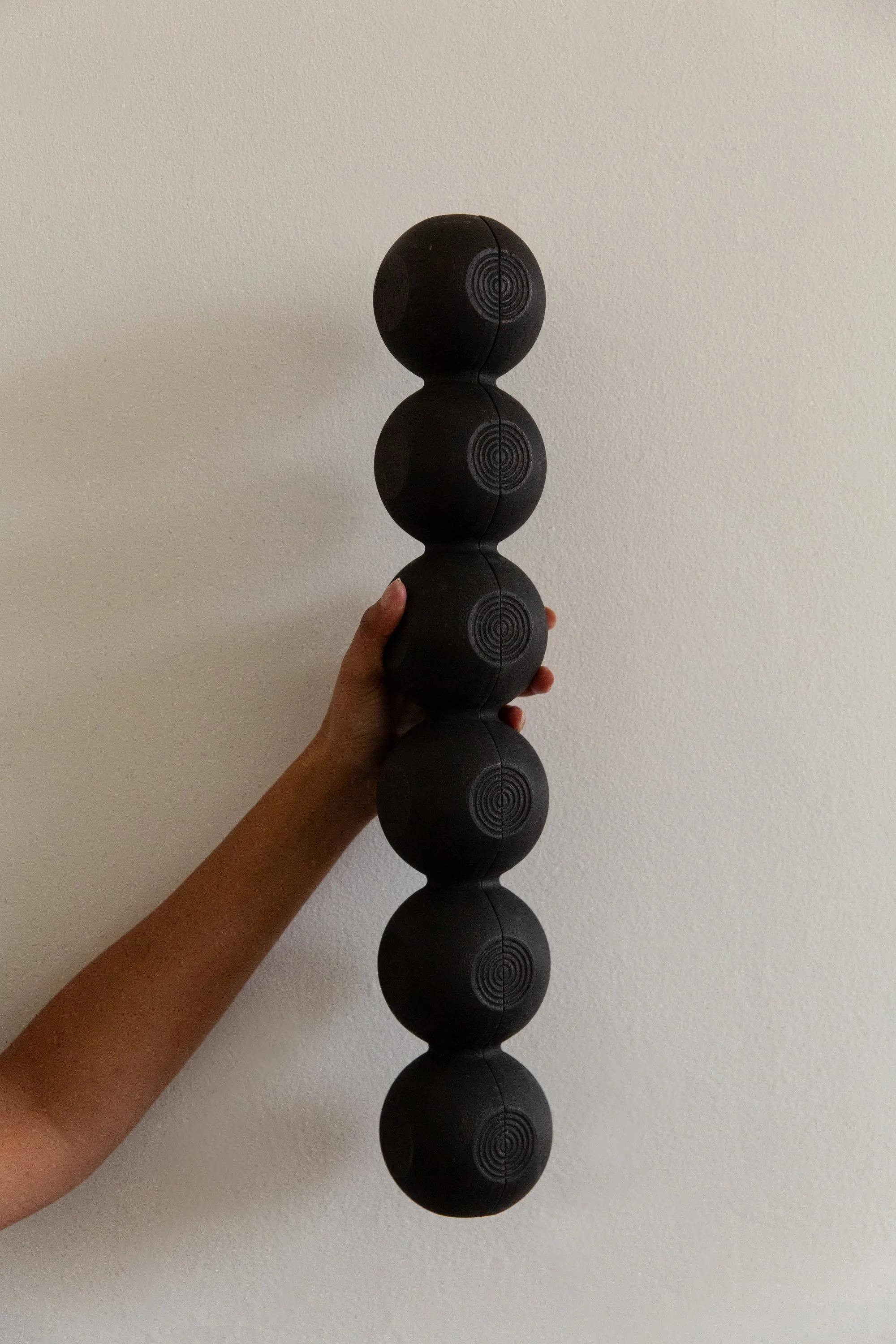 When not in play, Nchọ transitions to a display object as it magnetizes to a metal wall bracket, an accompaniment boldly demonstrating how utilitarian hardware can exist sculpturally within the African design ethos.